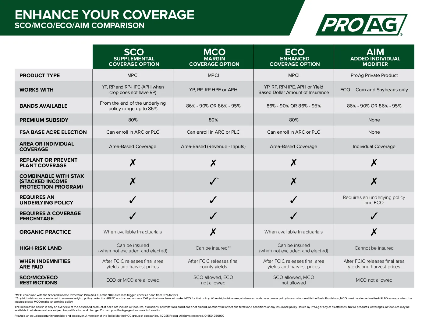 ECO offers coverage in addition to an MPCI policy. But it’s not a cure-all. Since it’s area-based, eligible producers can still experience localized crop losses without receiving an indemnity. That’s where ProAg’s Added Individual Modifier (AIM) coverage option comes in. The exclusive, individualized policy option extends ECO coverage at harvest to include properly documented, specific farm-level harvested production results, as opposed to area-based results, in states where AIM is available.