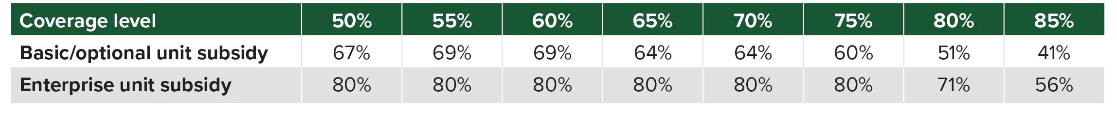Coverage levels range from 50% to 85% of your approved yield. Crop insurance premiums are subsidized as shown in the table below.